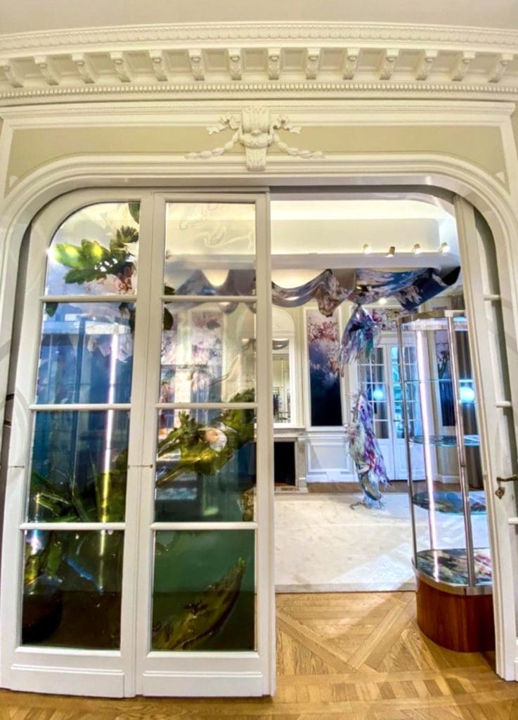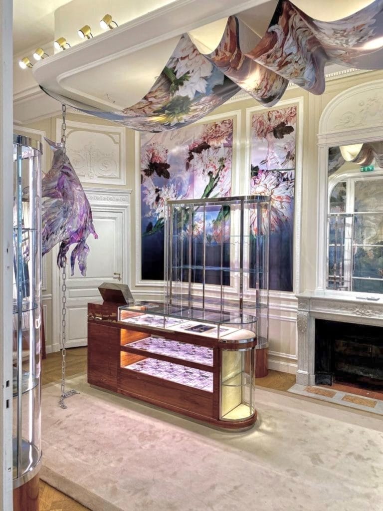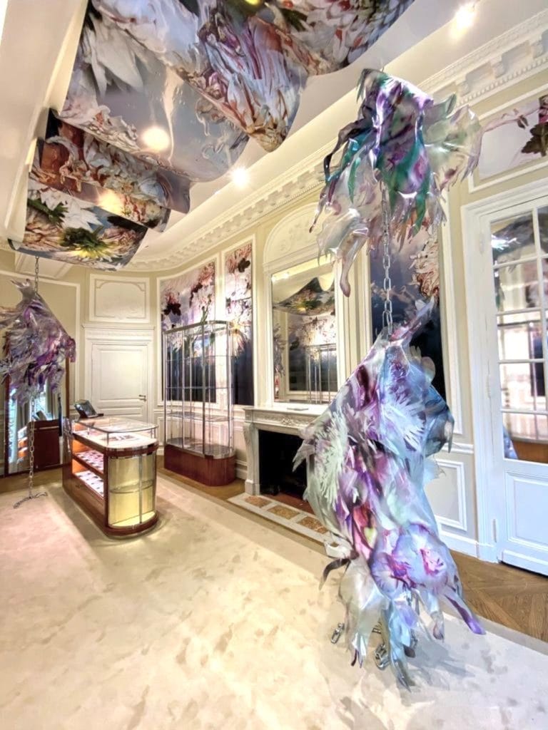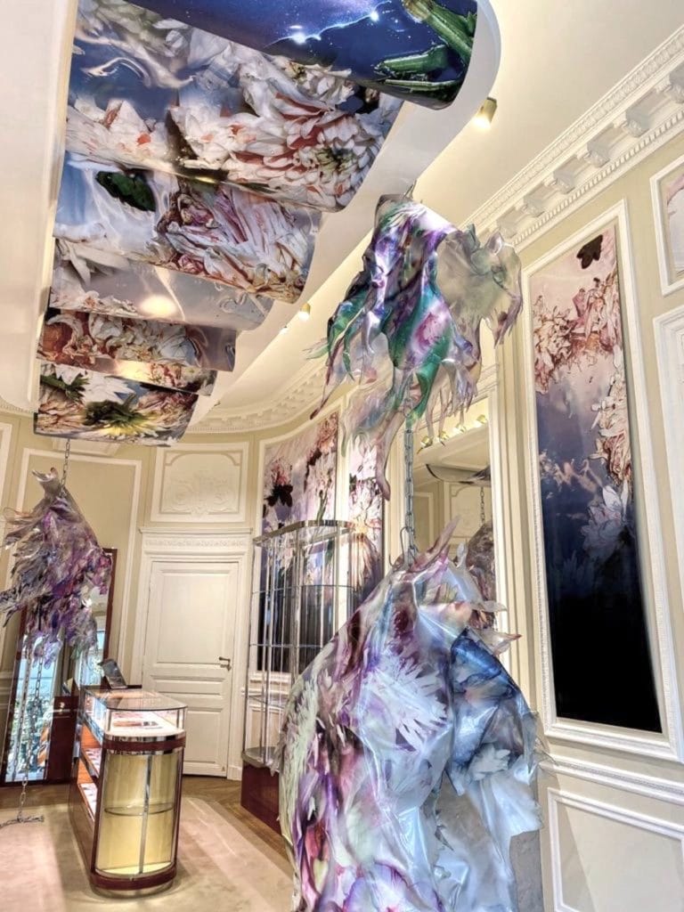 Pour cette exposition, Pauline d’Andigné a créé une série d’œuvres pour cet espace inédit. Installations plastique, œuvres digitales mais aussi papiers-peints : l’artiste s’est donné pour ambition d’habiter pleinement ce lieu de mode et de luxe.