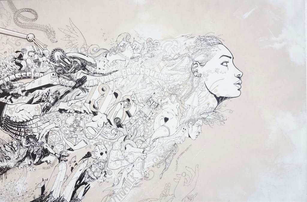 Les personnages semblent pris dans un tumulte visuel, figés en plein mouvement, comme si le temps lui-même avait été capturé dans une explosion graphique. Chaque trait est pensé, chaque contraste joue un rôle, et l’ensemble donne une impression d’énergie pure, prête à jaillir du cadre.